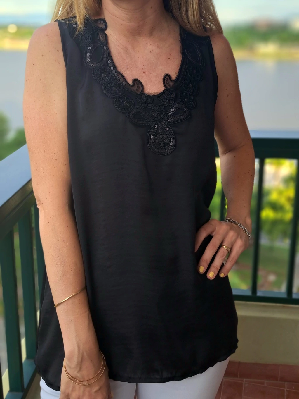 -Diseño: Blusa suelta, mangas musculosa y cuello con detalles de bordado y lentejuelas. Ideal para para esta época y es tu look ideal para estas noches!