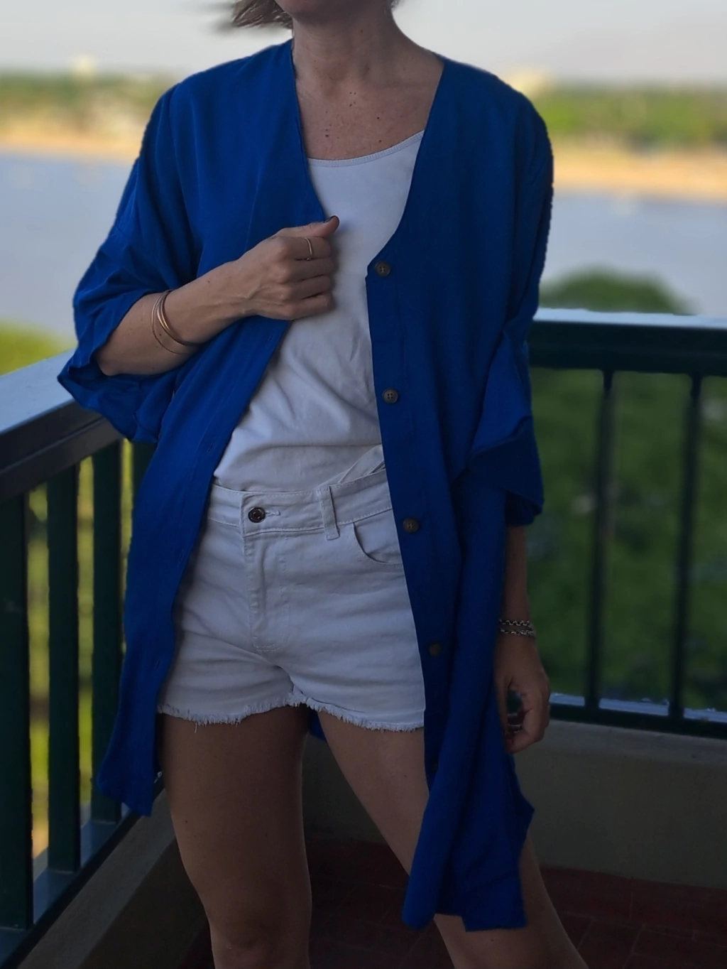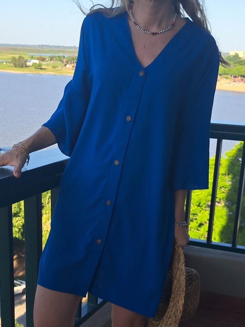 -Diseño: mangas al codo y detalles de volados. Escote en V, y botones al frente en todo el largo. Para usarla solo, o sobre calzas, tanto de día como de noche
