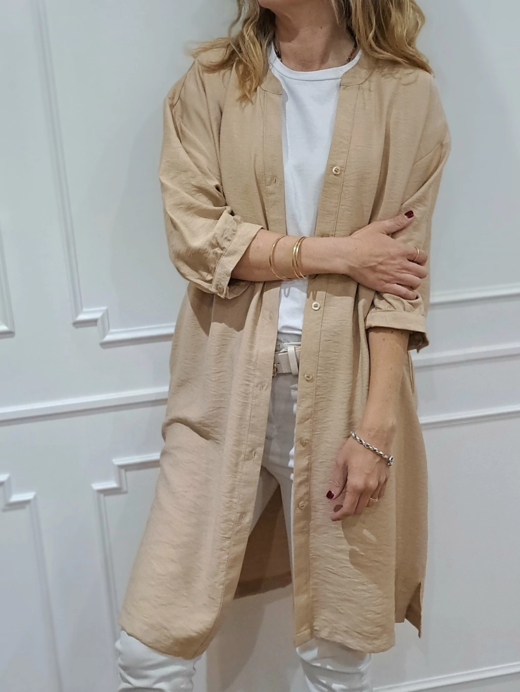 -Diseño: Camisero que también se puede usar como vestido. Tiene mangas 3/4, pequeños tajos laterales y cuello Mao. Ideal para para esta época y súper cómodo para usarlo de día y de noche!