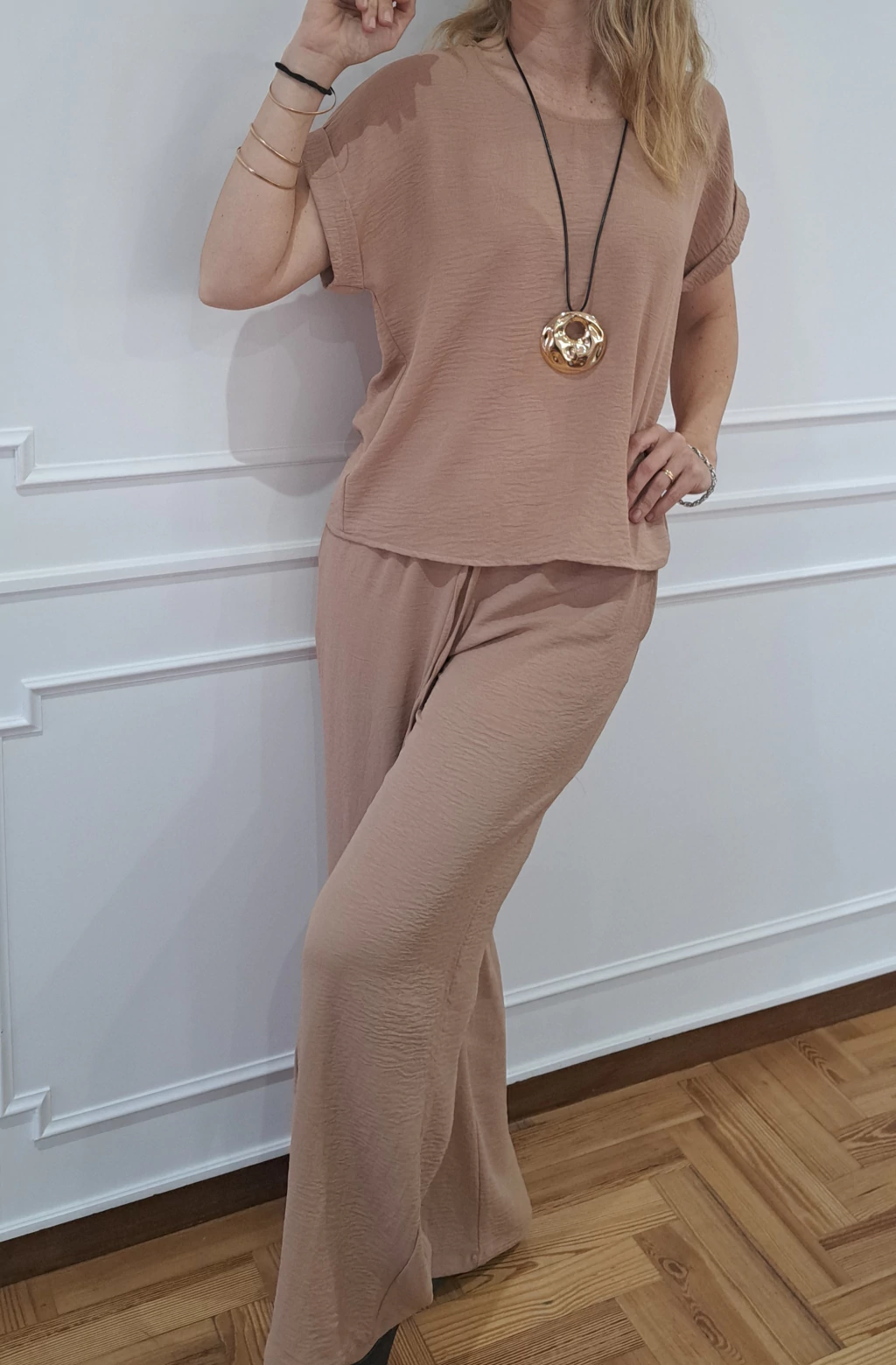 -Diseño blusa: es un modelo suelto con cuello redondo y mangas cortas. Detalle de dobles en mangas. Palazzo: modelo suelto, con bolsillos y elastico en cintura. Divino para usarla tanto de día como de noche.